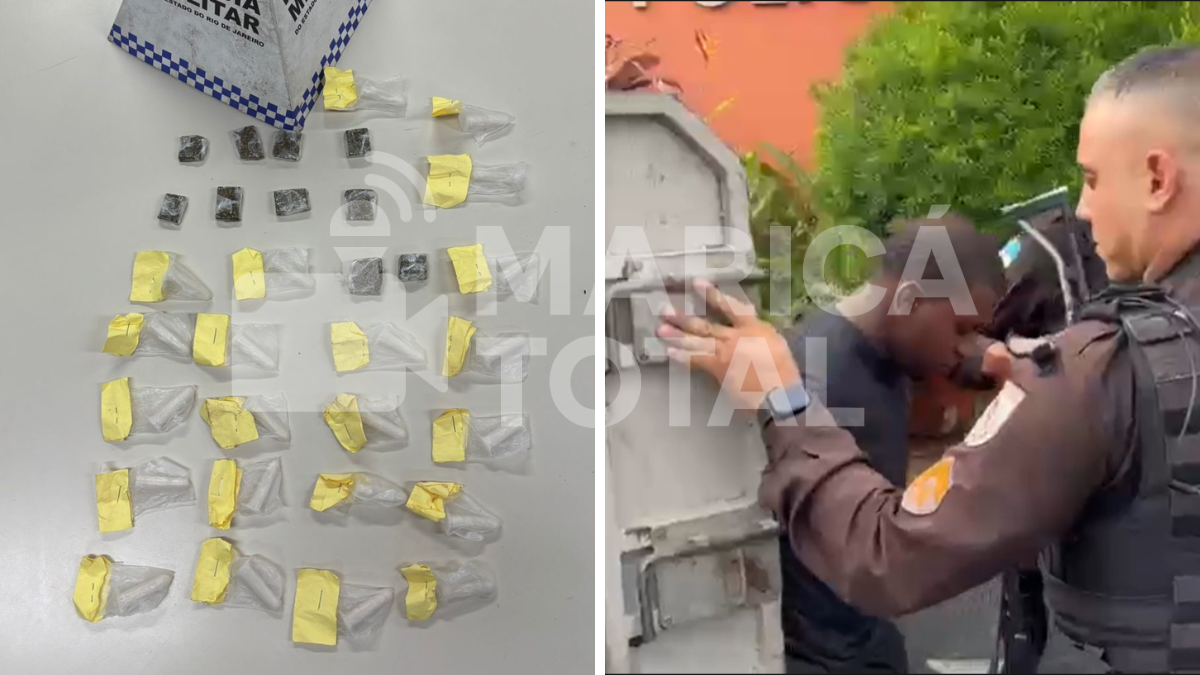 Ao todo, foram apreendidos 22 pinos de cocaína e 10 porções de maconha. O suspeito foi detido e apresentado na delegacia, onde permaneceu à disposição da Polícia Civil.